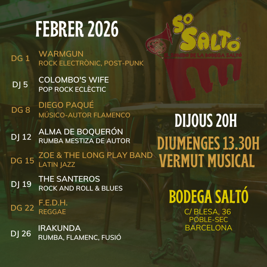 A la Gran Bodega Saltó som pioners en l’organització de Vermuts Musicals a Barcelona. Des dels nostres inicis en els primers anys del segle XXI, hem establert la tradició de fer un vermutet, unes olives i unes escopinyes escoltant música en directe en format acústic. Rock, rumba, blues, mestissatge, cançó d’autor… música de tots els estils tot creant un ambient encisador on de ben segur us hi trobareu molt a gust. Fem música en viu dos cops per setmana: Vermut Musical cada diumenge a partir de les 13.30h i també cada dijous a les 20h.