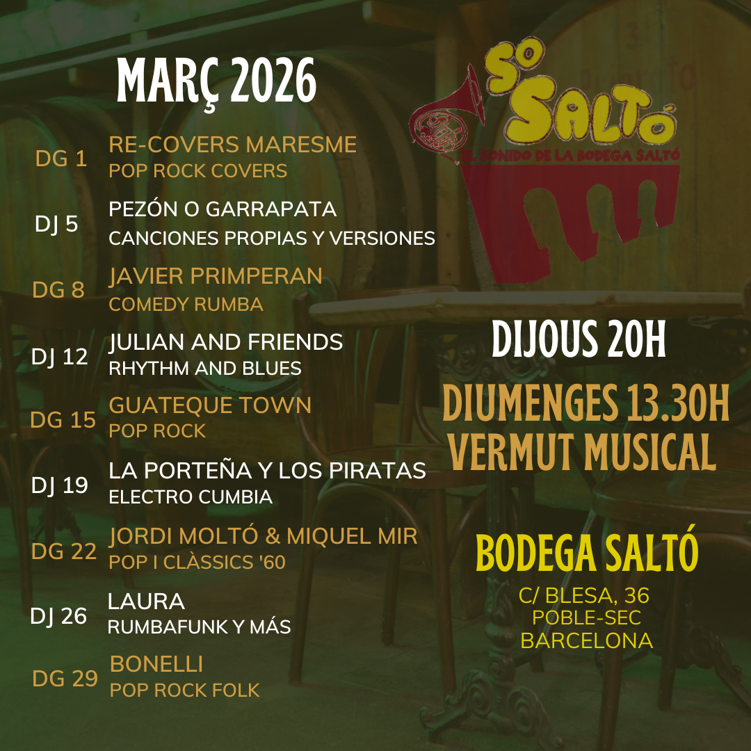 La Gran Bodega Saltó és una de les poques sales que porta més de vint anys oferint música en viu. Va ser una de les primeres a programar concerts els diumenges al migdia, i a participar des de l’inici en la Festa Major de Poble Sec, muntant un escenari davant de la seva façana per on han desfilat una gran quantitat d’artistes d’aquesta ciutat. A més, fa un temps també s’hi organitzen actuacions els dijous a les vuit de la tarda, convertida així en una part important del circuit musical de Barcelona.